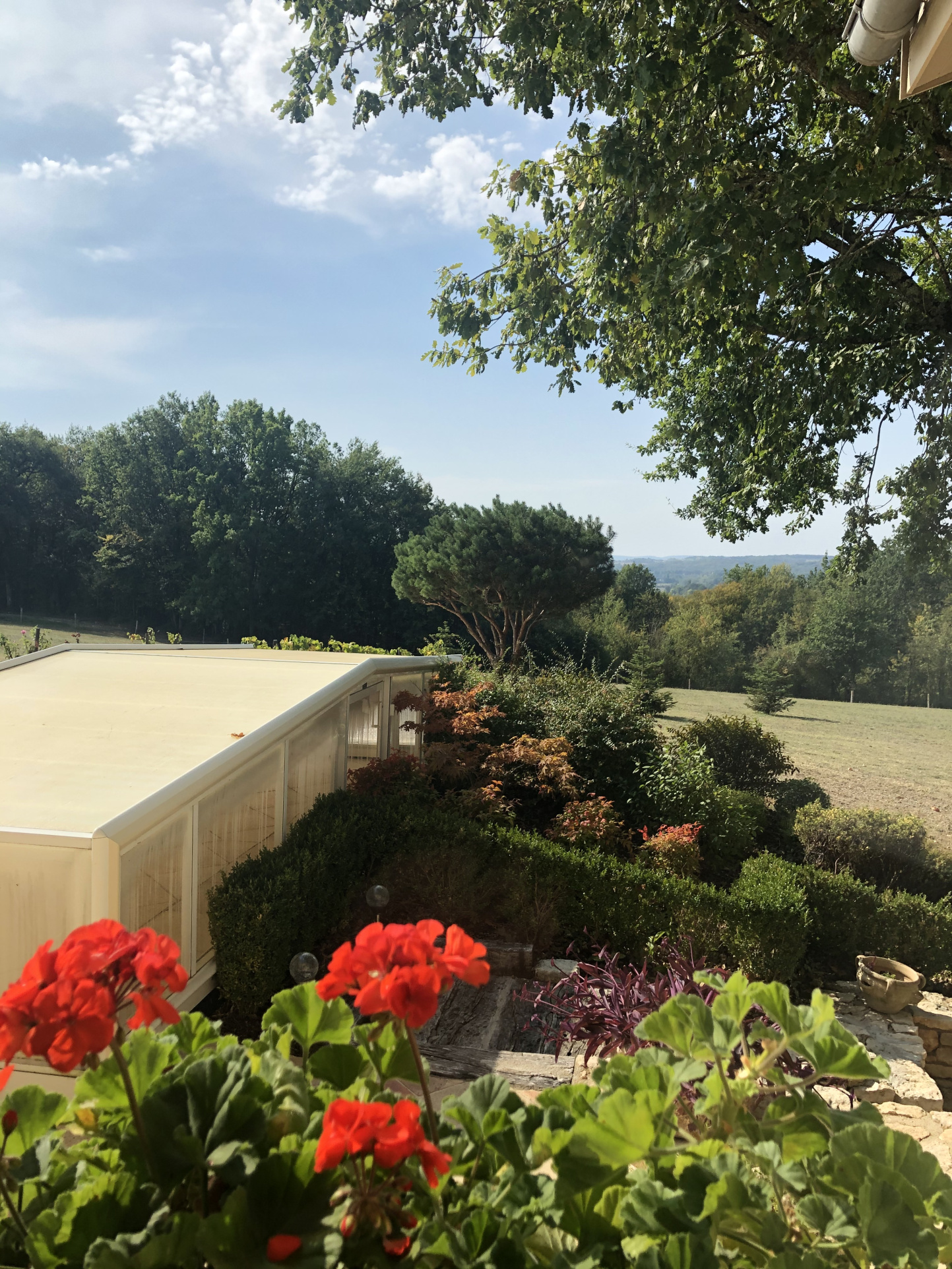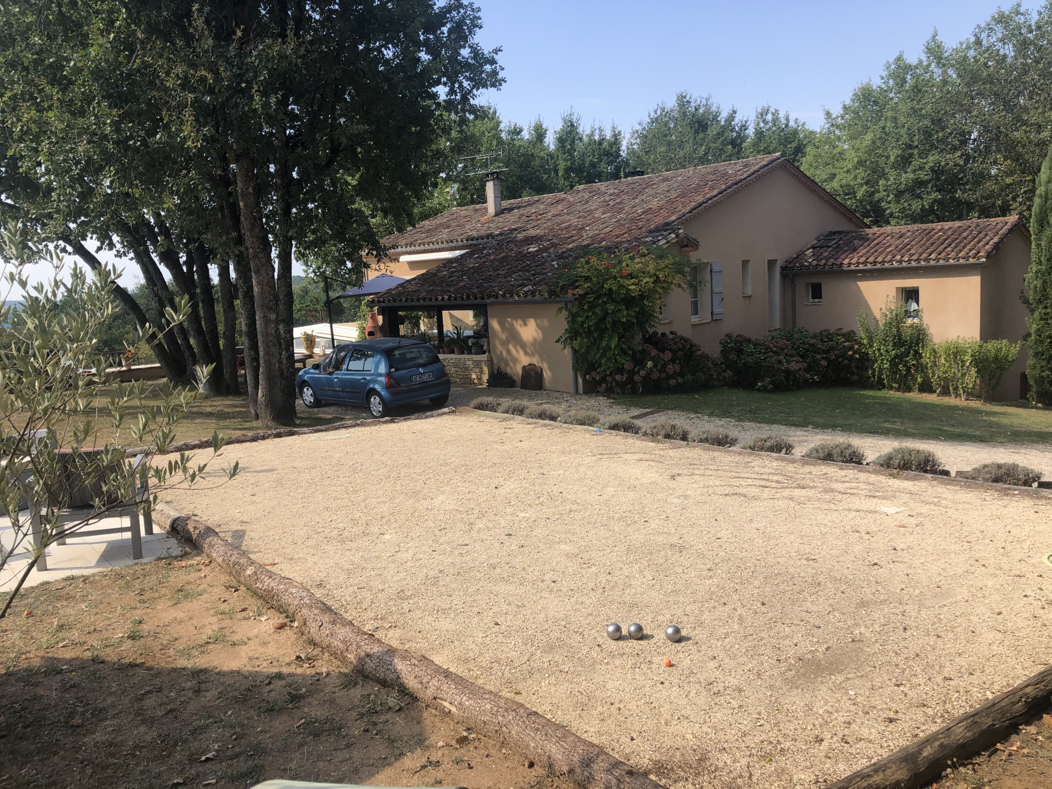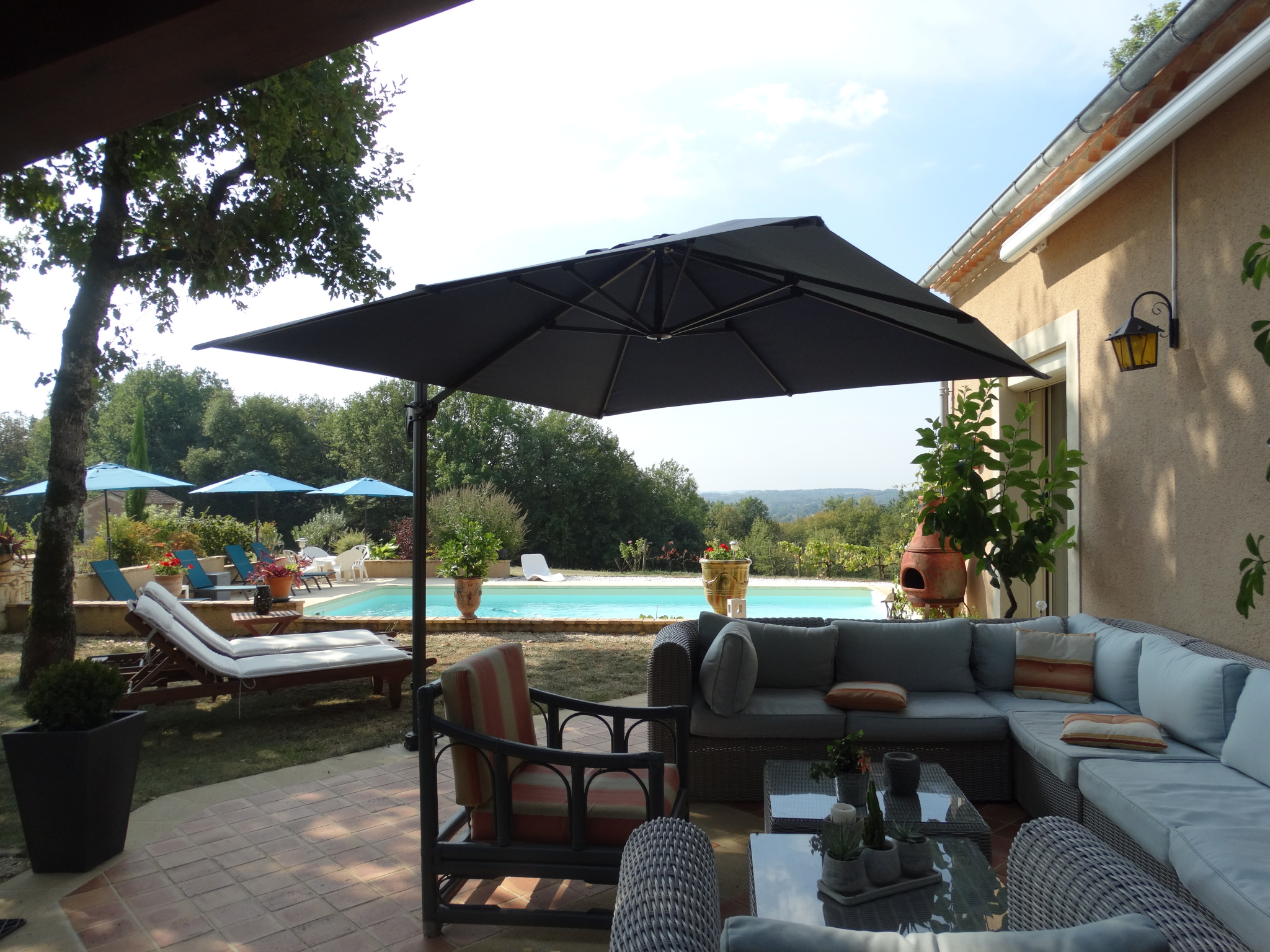 Au niveau inférieur et également de plain-pied une chambre indépendante avec sortie sur l'extérieur, sa salle de bain baignoire balnéo (marque Granform), salle de jeu de 35 m². Garage, coin pool house, cave . Côté Est, très jolie terrasse couverte de 24 m² avec sa cuisine d'été qui se prolonge par une terrasse ouverte (protégée du soleil par un store banne) sur la piscine.. La piscine recouverte d'un abri motorisé rétractable (éléments neufs) laissant la vue libre de sur la terrasse. Murettes, escaliers pierre, massifs agrémentent les abords proches de la maison, le reste du terrain (1 ha 40 en totalité) est planté de fruitiers, chênes truffiers, bosquet avec des essences locales et prairie. Il y a une vue différente à chaque coin de la maison (village, collines, campagne, vue lointaine) La maison est chauffée dans sa plus grande partie par un poêle de masse, la véranda par chauffage au sol électrique.