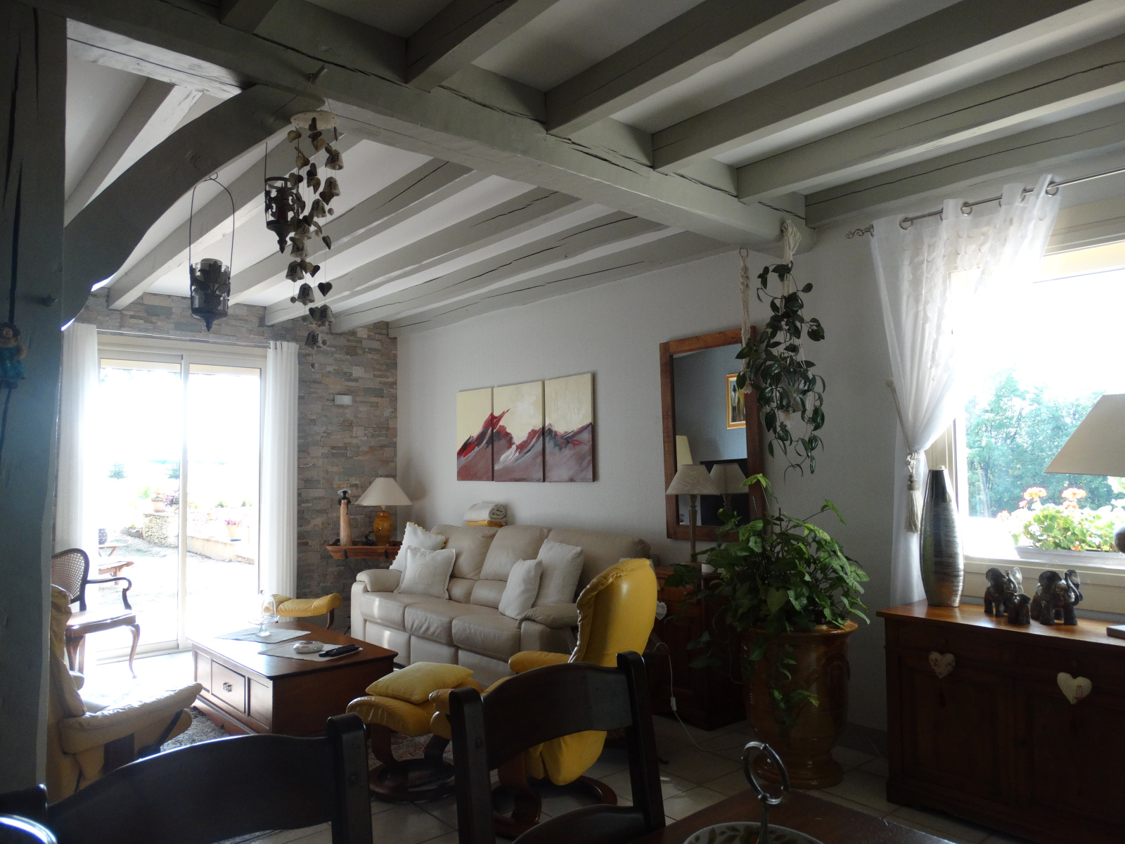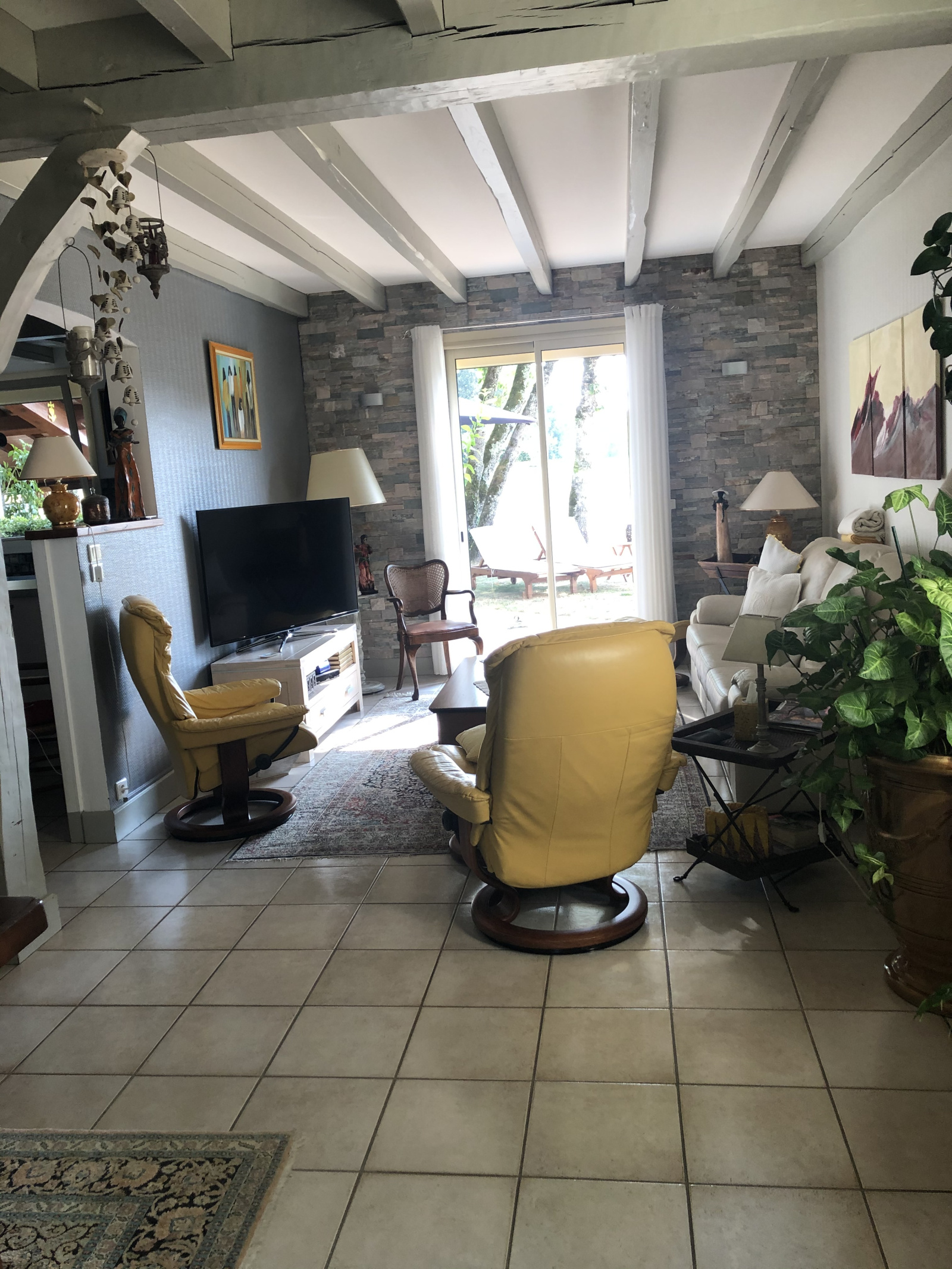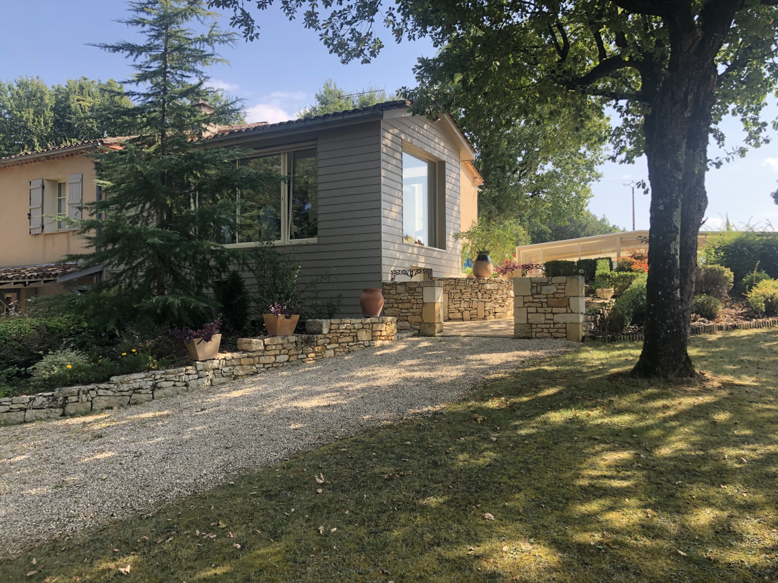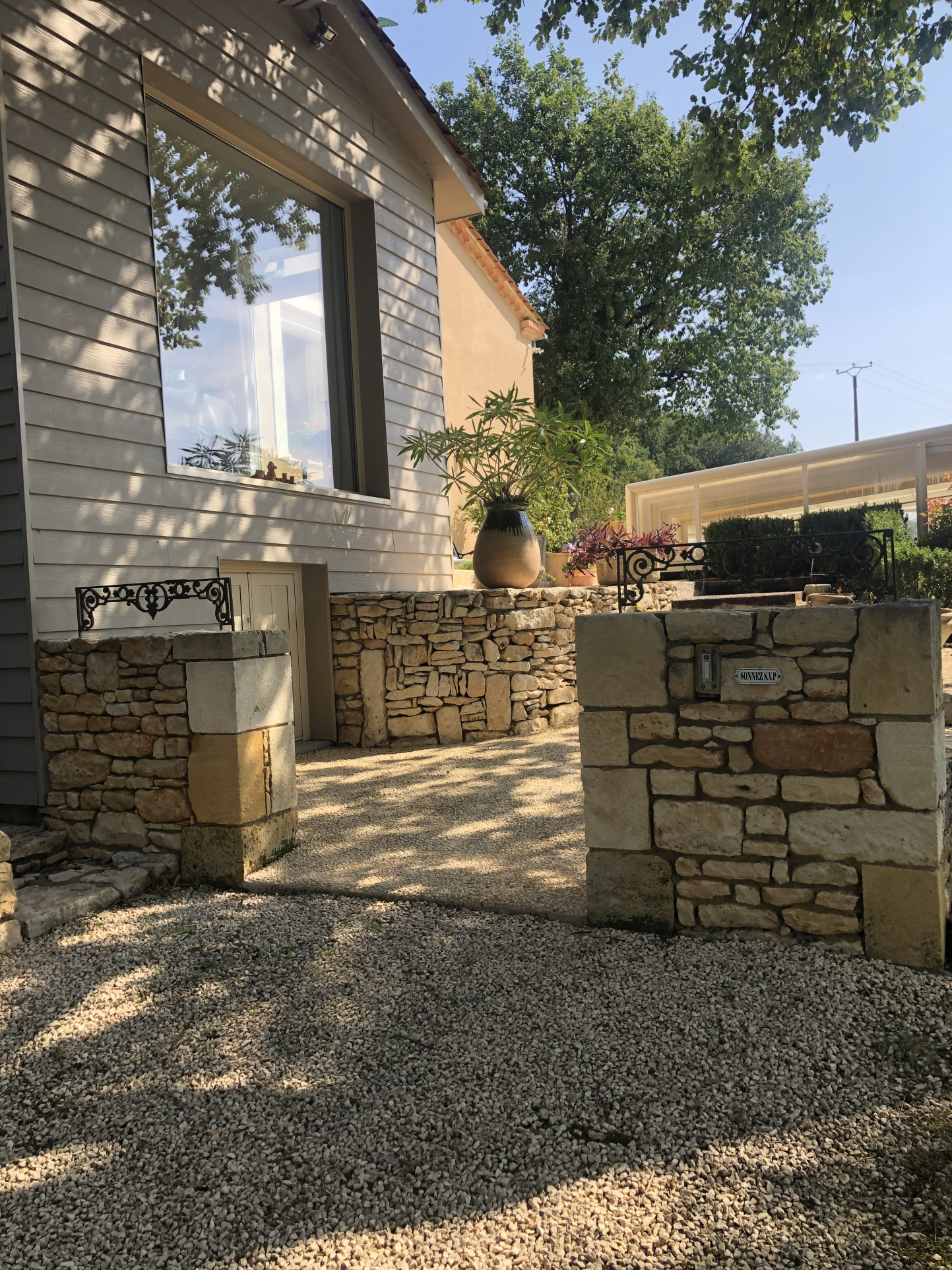 Coté Sud-Est et de plain pied avec la terrasse de la piscine, belle pièce de vie d'environ 55 m² avec son coin cuisine, salon, séjour, à l'opposé le soleil se couche sur une très jolie véranda (19 m²) recouverte d'un bardage ton pierre, le retour sort sur la terrasse piscine agrémenté de murettes en pierre et massifs.