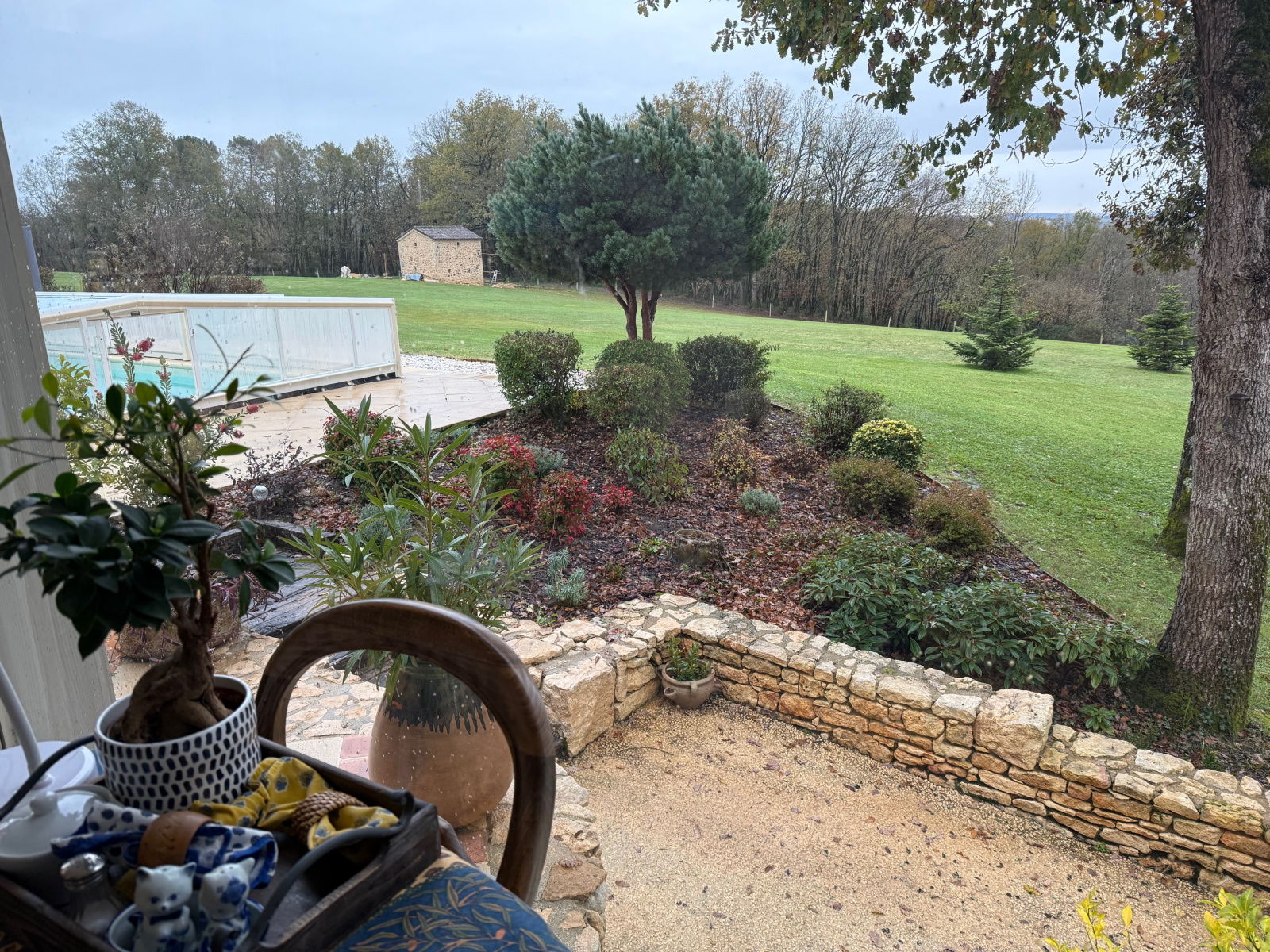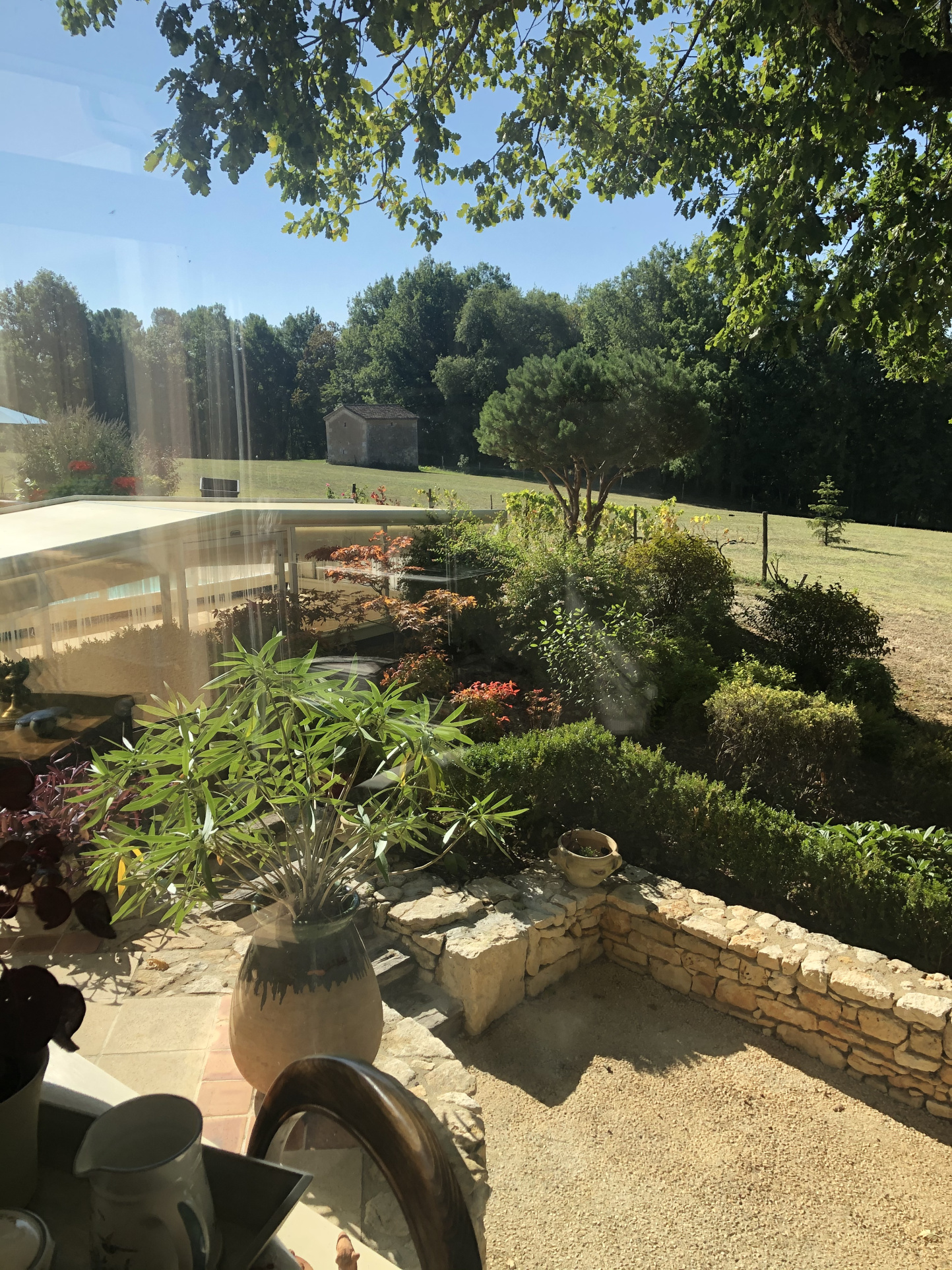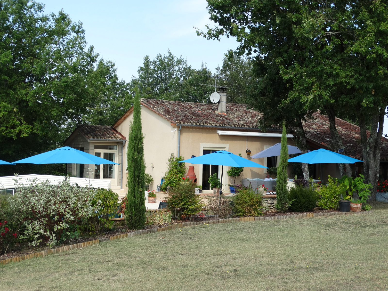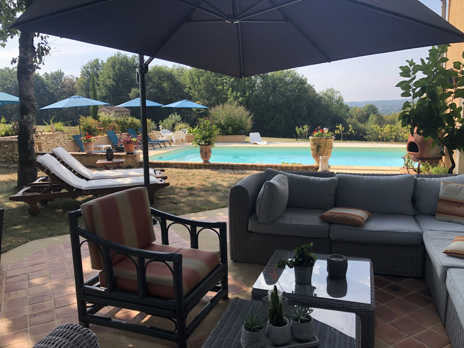 Coté Sud-Est et de plain pied avec la terrasse de la piscine, belle pièce de vie d'environ 55 m² avec son coin cuisine, salon, séjour, à l'opposé le soleil se couche sur une très jolie véranda (19 m²) recouverte d'un bardage ton pierre, le retour sort sur la terrasse piscine agrémenté de murettes en pierre et massifs.